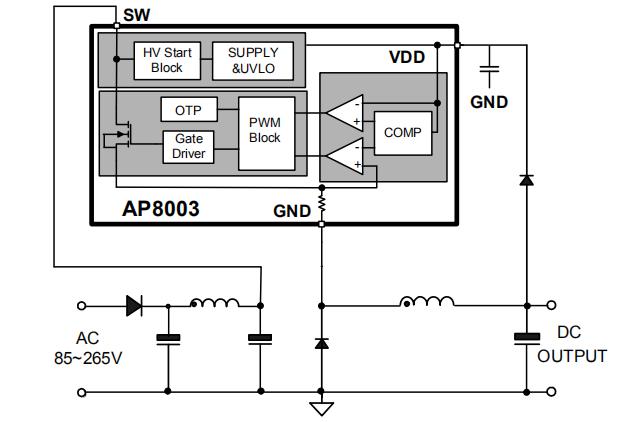 AP8003非隔离交直流转换芯片集成PFM控制器及500V高可靠性MOSFET,用于外围元器件极精简的小功率非隔离开关电源。AP8003内置500V高压启动,实现系统快速启动、超低待机功能。该芯片提供了完整的智能化保护功能,包括过载保护,欠压保护,过温保护。另外AP8003非隔离交直流转换芯片具有优异的EMI特性。