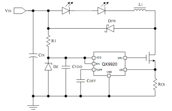QX9920采用固定关断时间的峰值电流控制方式,其工作频率最高可达1MHz,可使外部电感和滤波电容体积减小,效率提高,节省PCB面积。关断时间最小为620ns,并可通过外部电容进行调节,工 作频率也可根据用户要求进行调节。在EN端加PWM信号,可调节LED灯的亮度。