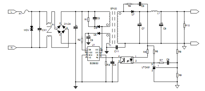 SD6830是一款高度集成的电流模式PWM+PFM控制芯片,内置振荡器、内置高压管和降频功能,IC具有完整的自恢复保护功能,该电源控制器工作于典型的反激拓扑电路中,构成简洁的AC/DC电源转换器,在85V-265V的宽电压范围内提供12W的连续输出功率。