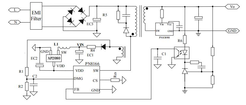 AP2080低成本辅助供电升压芯片典型应用于65W快充方案PN8213+PN8307P+AP2080,AP2080 Boost芯片支持宽供电输出,使用兆赫兹开关频率的COT控制技术,将储能电感体积降至0805封装,任何工况下PN8165供电范围控制在11~35V,显著提升15~20V输出电压下的转换效率。