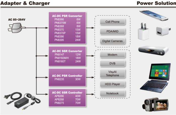 在适配器和充电器领域Chipown具备完整功率段的AC/DC开关电源芯片产品,为客户提供5-10W内置高压启动及功率管的PSR系列、10-18W内置高压启动及功率管的Flyback系列、15-90W外置MOS控制器系列等多种架构的产品,并提供高性价比、性能优异、品质稳定的Adapter/Charger系统参考设计方案。