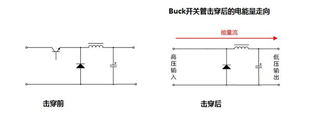 对于Buck电路而言,若开关管击穿短路,由于没隔离,输入端较高的电压,直接通过电感作用在负载端,负载会因为过压烧毁。