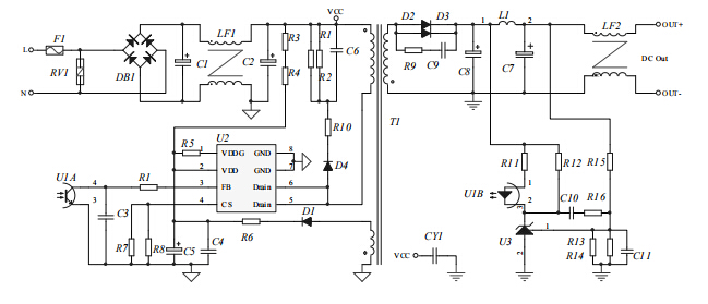 ● 电路结构简单、较少的外围元器件,适用于小功率 AC/DC 电源适配器、充电器。