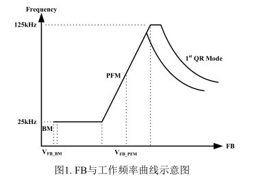 1. 启动:在启动阶段,内部高压启动管提供1mA电流对外部V DD 电容进行充电。当V DD 电压达到 VDDon ,芯片开始工作;高压启动管停止对V DD 电容充电。启动过程结束后,变压器辅助绕组对V DD 电容提供能量。