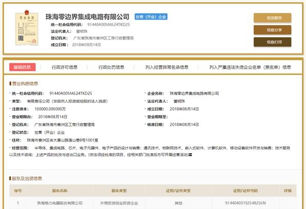 自2018年4月,格力电器截留分红向集成电路领域发起进攻后,格力的造“芯”计划备受关注,在2018年8月,董明珠宣布了他对芯片领域的高调宣布,建立了全资子公司“珠海零边界半导体”,注册资本10亿,新公司主业是芯片设计,初步专注研发高端的空调芯片、物联网芯片和智能家居芯片。