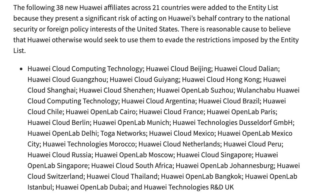 其中增加了一条新的单独规定要求,其显示当实体清单上的华为及其子公司作为“买方、中间收货人、最终收货人或最终用户”时,该公司必须获得许可,此外基于美国软件和技术的产品不能用以制造或开发任何华为子公司(实体名单内)所生产、购买或订购的零部件、组件或设备中。