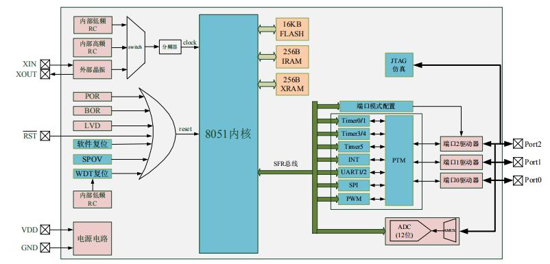 GF90F0320 是一颗采用高速低功耗 CMOS 工艺设计开发的增强型 8 位单片机,内部有 16K Bytes FLASH 程序存储器,256 Bytes IRAM 和 768 Bytes XRAM,最多 18 个双向 I/O 口,1 个 外设功能引脚全映射模块 PTM,5 个 16 位定时器/计数器,3 组 16 位带死区控制互补 PWM,1 个 8 位 PWM,2 个 UART,1 个 SPI,1 个 IIC,16 个外部中断,11+2 路 12 位 ADC,四种系统工作模式(正常、低频、掉电和空闲)和 17 个中断源。