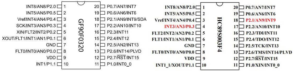 单片机是指一个集成在一块芯片上的完整计算机系统,它具有高可靠性、功能强、高速度、低功耗和低价位等特点,是针对运算和控制比较简单的电子产品,被广泛应用于计算机外部设备、工业实时控制、仪器仪表、通讯设备、家用电器等各个领域。8位flash型单片机GF90F0320和HC89S003P都是采用TSSOP-20封装,脚位和功能基本一致,在实际应用中可实现代换兼容。