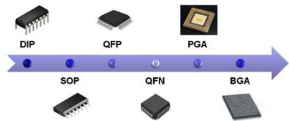 常见的集成电路芯片封装主要分为DIP双列直插和SMD贴片封装两种。从结构方面,封装经历了最早期的晶体管TO封装发展到了双列直插封装,随后开发出了SOP小外型封装,以后逐渐派生出SOJ、TSOP、VSOP、SSOP、TSSOP及SOT、SOIC等,随着整机向着多功能、小型化方向变化,要求集成电路的集成度越来越高,功能越来越复杂,集成电路封装技术要求也越来越高,集成电路封装是伴随集成电路的发展而前进的,集成电路封装质量的好坏,对集成电路总体的性能优劣关系很大,因此,封装应具有较强的机械性能、良好的电气性能、散热性能和化学稳定性。