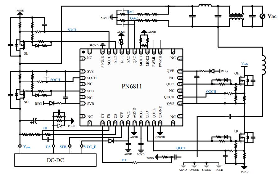 PN6811图腾柱PFC控制芯片内置环路控制,集成完善的保护功能,包括内外部过温保护,交流欠压保护,VCC欠压保护,输出过压保护,交流跳变保护,逐周期过流保护,以及端子开短路等保护。