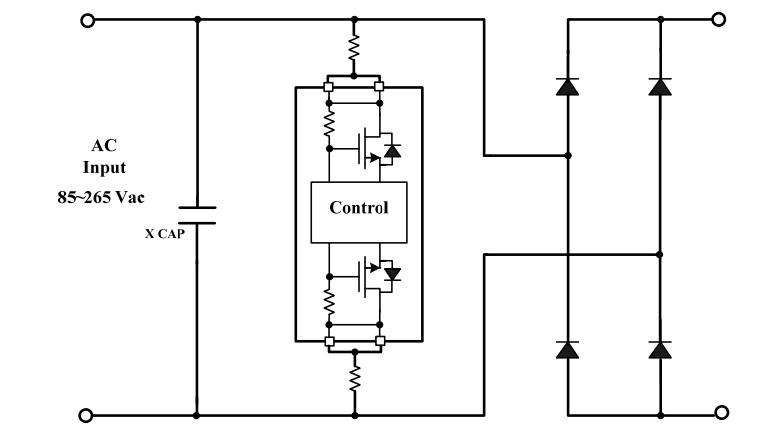 PN8200是一款具有两个端子的X电容放电专用芯片,其待机损耗低同时能够满足电源系统的安规标准。PN8200内置了两个高压VDMOS开关,可有效的保护芯片避免雷击或浪涌的应力。芯片通过两个放电电阻接入到开关电源的交流输入端,当AC电压接入时,会有极低的电流流进芯片,芯片的待机损耗功率在5mW以内,当AC电压断电后,可通过放电电阻对X电容放电。放电电阻和X电容可灵活选择以优化系统的EMI性能。